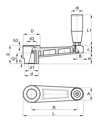 Korbka z rękojeścią obrotową stałą i tuleją gładką R-185mm d1H10-8mm