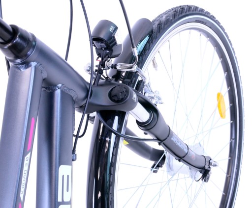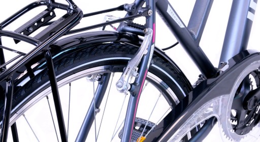 Skuteczne hamowanie to podstawa bezpieczeństwa każdego rowerzysty. Przedni i tylny hamulec V-Brake jest niezawodny i lekki. Łatwo go naprawić w trasie, co jest dużym atutem! Na bezpieczeństwo wpływa także oświetlenie na przód i tył zasilane dynamem, dzięki któremu z daleka zauważą Cię inni uczestnicy ruchu drogowego.