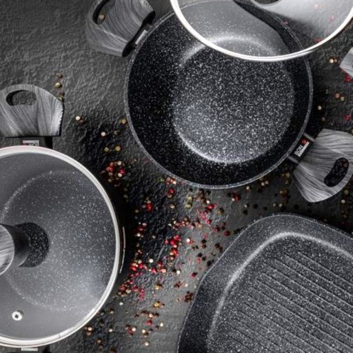 - Powłoka patelni wzmacniana jest drobinkami marmuru: dzięki czemu jest niezwykle trwała i odporna na ścieranie
