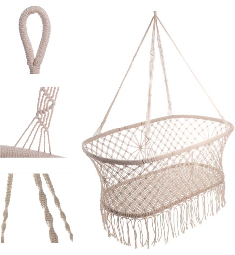 Wykonana z bawełnianego sznurka wisząca kołyska w stylu BOHO, świetnie wpasuje się do każdego wnętrza jako alternatywa dla dużych, ciężkich łóżeczek dziecięcych zajmujących mnóstwo miejsca.