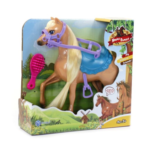 Koń z długą, piękną grzywą - marzenie każdej dziewczynki. Nasz konik wyposażony jest w ściąganą uzdę oraz siodło.