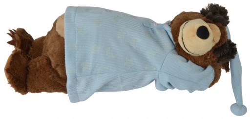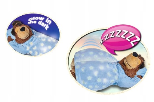 Miś ubrany jest w błękitną czapeczkę i koszulę nocną, która jest dodatkowo ozdobiona gwiazdkami i księżycami świecącymi w ciemnościach.