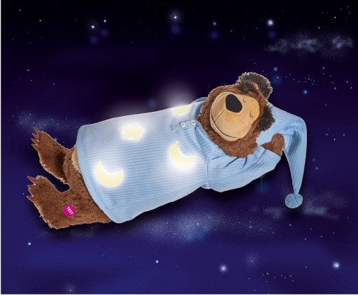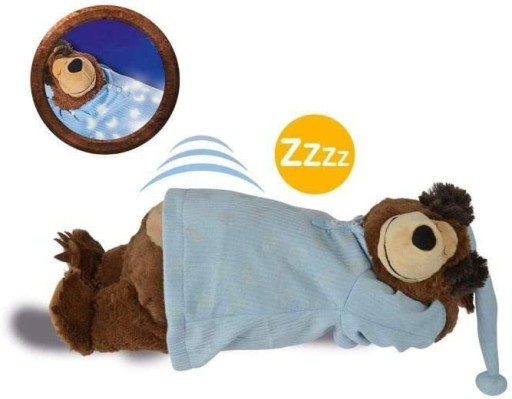 Po naciśnięciu jego lewej łapki niedźwiadek zaczyna chrapać, a jego brzuszek unosi się do góry.
