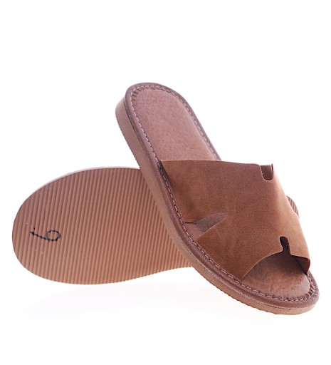 - Damskie kapcie wykonane ze skóry naturalnej w kolorze brązowym.