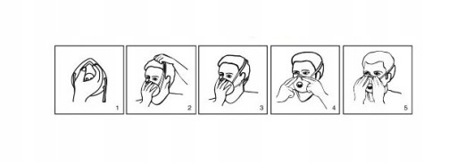 5. Sprawdzić prawidłowość założenia; przyłożyć dłonie i przytrzymać czaszę; mocno wydmuchnąć powietrze; w przypadku nieszczelności wyregulować pozycję czaszy, zacisk nosowy lub taśmy nagłowia.