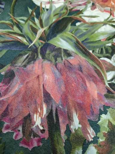 Wzór: Gąszcz różnorodnych kwiatów z łodygami i liśćmi lub bez, oraz pojedyńczy malutki motylek. Bardzo realistycznie odwzorowane wielobarwne kwiaty - kolory stonowane, spokojne, od przełamanej bieli, poprzez jasne i średnie, aż do zupełnie ciemnych. Pełna paleta barw pozwala łatwo dobrać odpowiednie tło na pozostałe ściany. Tło tapety cieniowane w obłoczki, w kolorze trąconego zielenią grafitu do prawie czarnego. Układ wzoru i dbałość o szczegóły oraz cieniowanie tła pozwoliło uzyskać realistyczny efekt 3D. Doskonałej jakości tapeta laserowa-sprasowany winyl, na spodzie z flizeliny, zmywalna.