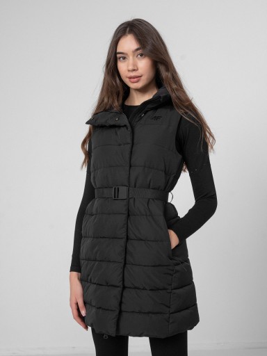 Bezrękawnik puchowy pikowany ze stójką damski. Dzięki wypełnieniu z puchu syntetycznego i dłuższemu krojowi zapewni ci komfort cieplny w chłodniejsze dni. W talii znajduje się pasek, który możesz wyregulować i wygodnie dopasować bezrękawnik do swojej sylwetki.