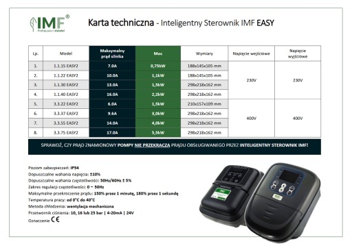 Przy doborze falownika nie bierzemy pod uwagę mocy silnika, ponieważ jest to moc oddawana, mierzona na wale pompy. Moc pobierana przez silnik jest wyższa i to do niej dobieramy falownik, dlatego znaczenie ma natężenie prądu, wyrażone w amperach - znajdziesz je na tabliczce znamionowej silnika lub w katalogu producenta. W przypadku pomp "ekonomicznych" zalecamy przewymiarowanie prądu znamionowego o 15-20%.