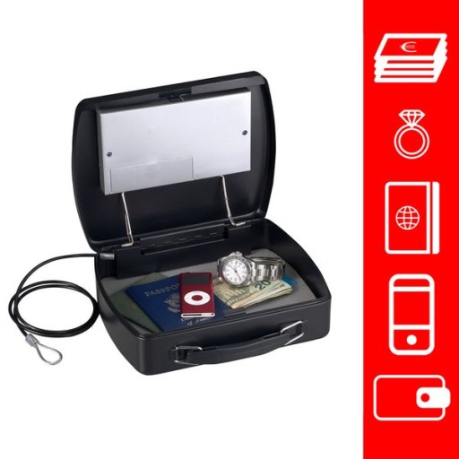 Zamykane pudełko podróżne na kosztowności P008EML. Odporna konstrukcja stalowa. 2 regulowane kombinacje cyfrowe połączone kluczem zerowym zasilany 4x bateriami AA (brak w zestawie). 2 klawisze do wprowadzania różnych kodów.