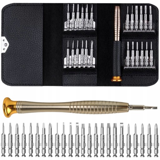Naprawa nowoczesnych urządzeń elektronicznych wymaga nie tylko umiejętności, ale również wykorzystania odpowiedniego, precyzyjnego sprzętu. Producenci stosują różnego rodzaju zabezpieczenia, co sprawia, że do ich otwarcia wymagane są dodatkowe końcówki, które trudno znaleźć w podstawowych zestawach wkrętaków. Zestaw specjalistycznych wkrętaków to 25 elementów znajdujących się w etui zamykanym na magnes. Każdy element posiada swoje własne miejsce, co pozwala na zachowanie porządku oraz sprawną organizację miejsca pracy, a tym samym jej szybkie i dokładne wykonanie. Komplet przeznaczony jest zarówno do napraw telefonów, smartfonów i tabletów jak również wszystkich innych urządzeń i sprzętów, które posiadają niestandardowe, drobne śruby.