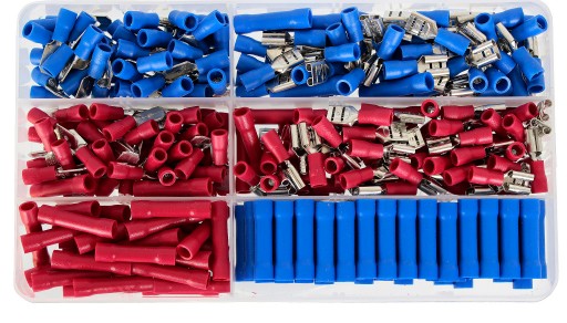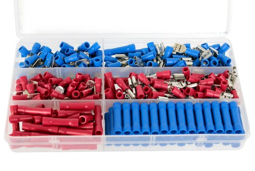Izolowane konektory zaciskane dostarczone w wygodnym solidnym opakowaniu ułatwiającym segregację na poszczególne rodzaje konektorów.