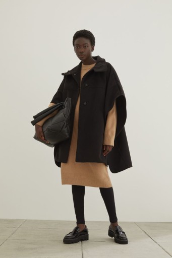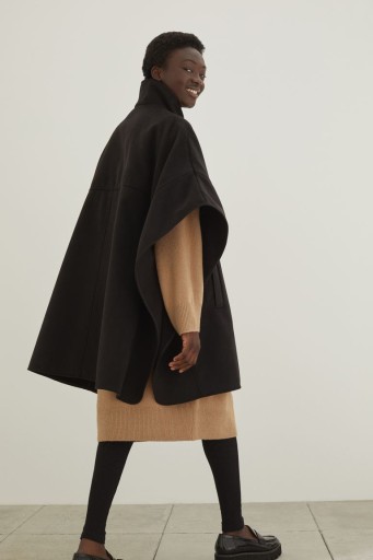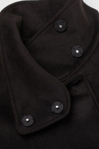 Tkaninowa peleryna z krytymi zatrzaskami wzdłuż przodu. Wysoka stójka zapinana na kryte zatrzaski. swobodny fason, szerokie rękawy 3/4. Po bokach rozcięcia z krytymi zatrzaskami, z przodu ukośne kieszenie z wypustką, nieco dłuższy tył. Bez podszewki.