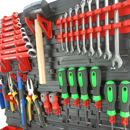 - W zestawie 17 sztuk kuwet, zestaw uchwytów do narzędzi (w sumie 20 sztuki) oraz 2 tablice ścienne 576 mm x 390 mm (po złączeniu 58 cm x 78 cm)