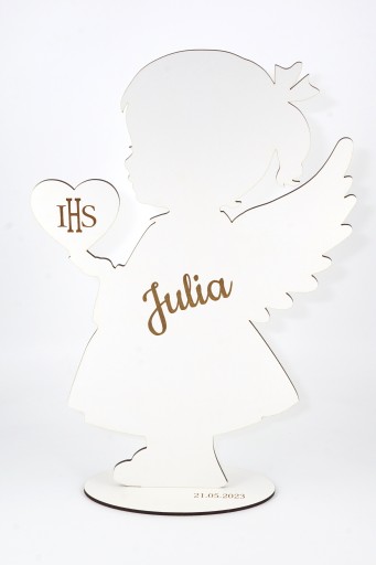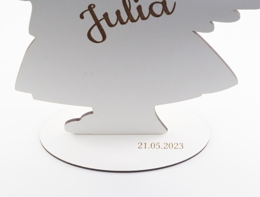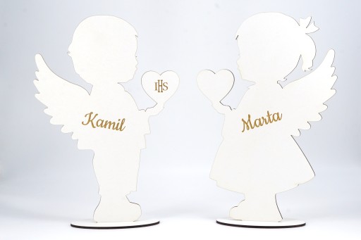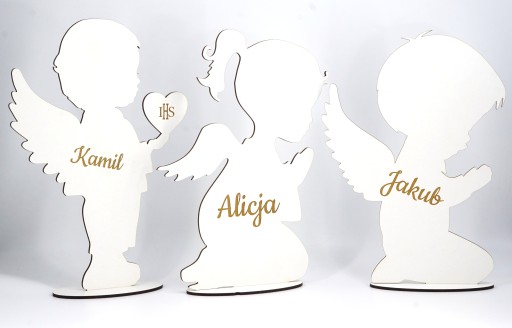 Personalizowany anioł stojący, wykonany z dwustronnie białej płyty HDFo grubości 3 mm. Imię na aniołku jest grawerowane( kolor brązowy)