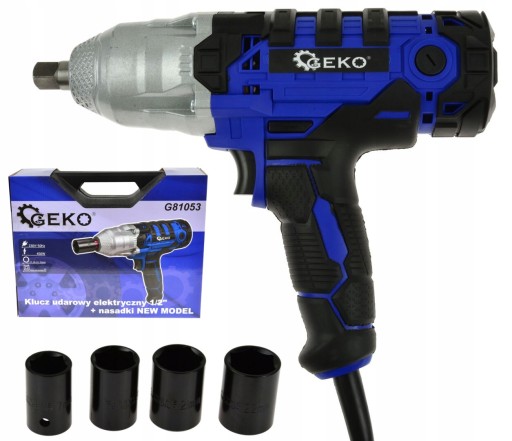 Niezawodny elektryczny klucz udarowy 1/2" o mocy 450Wrenomowanej marki GEKO, w zestawie z nasadkami CrV 17, 19, 21, 22mm. Moment obrotowy klucza podczas odkręcania wynosi 720Nm. Zasilany elektrycznie, dlatego nie potrzebuje do pracy kompresora. Klucz doskonale nadaje się do użycia w warsztatach samochodowych jak i w przydomowych garażach.