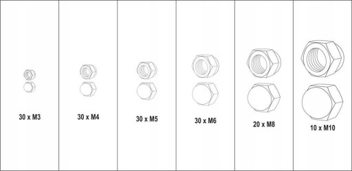 Zestaw 150 sztuk nakrętek metrycznych kołpakowych/zamkniętych. Zestaw zawiera rozmiary M3, M4, M5, M6, M8, M10. Całość umieszczono w wygodnym opakowaniu typu "sortownik".