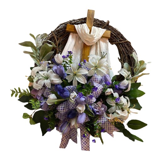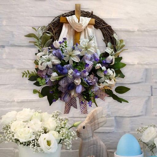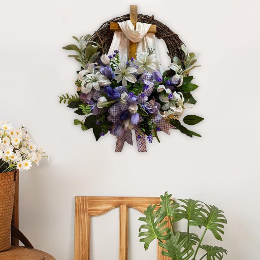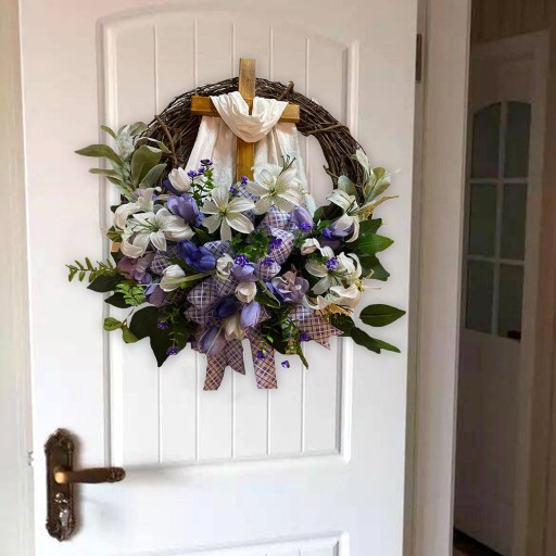 Wielkanocny wieniec krzyżowy: ten wielkanocny wieniec krzyżowy z białym jedwabnym szalikiem dodaje smaku sezonowej uroczystości i jest idealny na przyjęcia wielkanocne i dekoracje całoroczne.