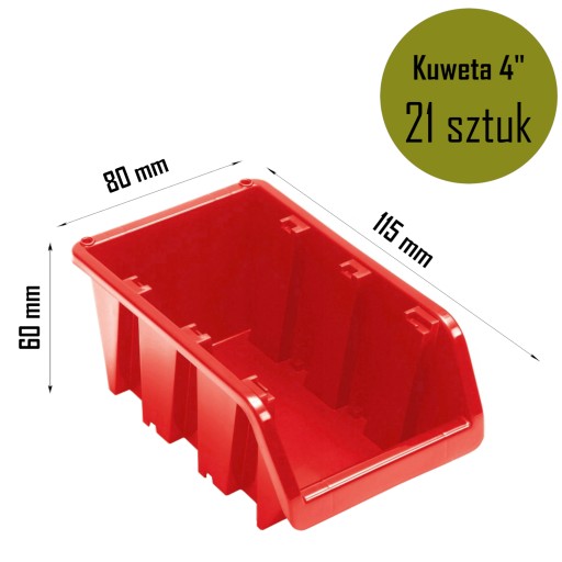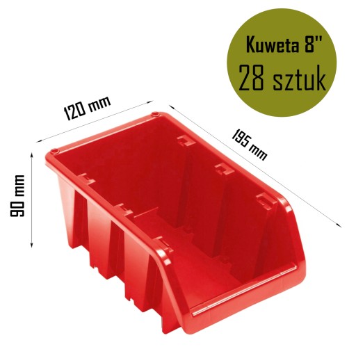 - W zestawie 49 sztuk kuwet, zestaw uchwytów do narzędzi (w sumie 40 sztuk), 8 półek oraz 6 tablic ściennych 576 mm x 390 mm (po złączeniu 173 cm x 78 cm)
