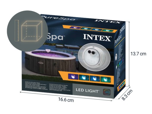 Lampa LED marki Intex sprawi, że kąpiel w jacuzzi stanie się czystą przyjemnością. Tworzy idealny nastrój oraz atmosferę podczas wypoczynku.