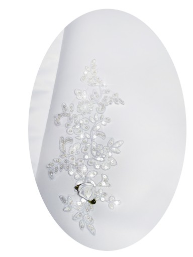 - Zdobienia - Lamówkowa tasiemka przepasająca z różyczkami (na życzenie doszyta na stałe). W dolnej części przepiękny połyskujący haft z cekinami.