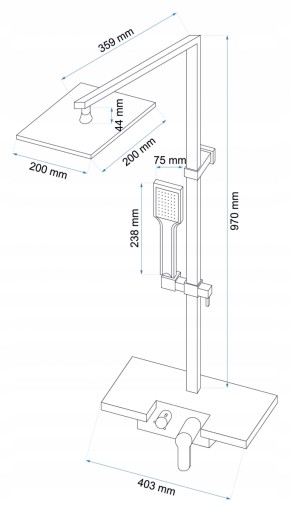 - Deszczownica + ramię + bateria + słuchawka + wąż + wylewka + box ułatwiający montaż