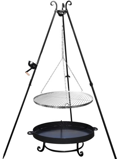 Kołowrotek posiada wygodną drewnianą rączkę, zapadka gwarantuję płynną oraz łatwą regulację wysokości rusztu, w komplecie linka, łańcuchy i karabińczyki