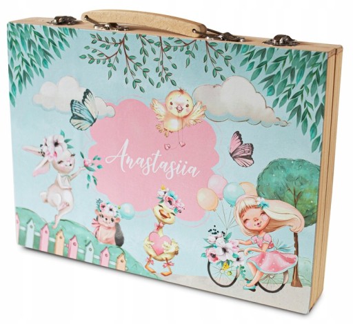 Zestaw akcesoriów do rysowania i malowania, w personalizowanej drewnianej walizeczce z wysokiej jakości kolorowym nadrukiem.