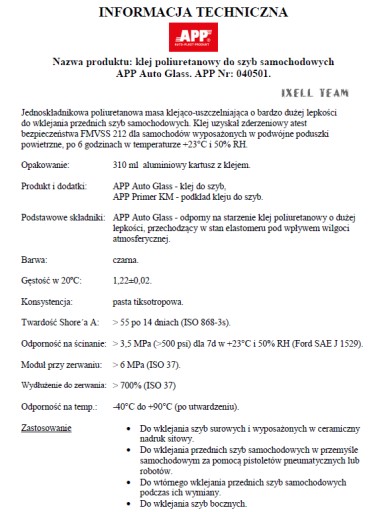 APP Auto Glass jest jednoskładnikową poliuretanową masa klejąco-uszczelniająca o bardzo dużej lepkości przeznaczoną do wklejania szyb samochodowych.