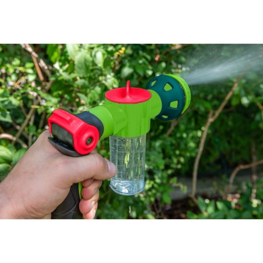 Wielofunkcyjny zraszacz pistoletowy z pojemnikiem i opryskiwaczem piany od marki VERTO. Posiada 8 praktycznych funkcji podlewania z wygodną możliwością dopasowania rodzaju strumienia do aktualnych potrzeb. Regulacja odbywa się za pomocą szybkiego przycisku ON/OFF, obsługiwanego za pomocą kciuka. Umożliwia wybór strumienia o różnej sile oraz funkcjonalności. Czytelne oznakowanie rodzajów strumienia ułatwia oraz przyspiesza zadania. Ergonomiczny, dwumateriałowy uchwyt umożliwia długotrwałe użytkowanie zraszacza, a wbudowany pojemnik oraz opryskiwacz piany poszerzają zakres jego działania. Zraszacz od marki VERTO polecany jest na wiele sezonów pracy.