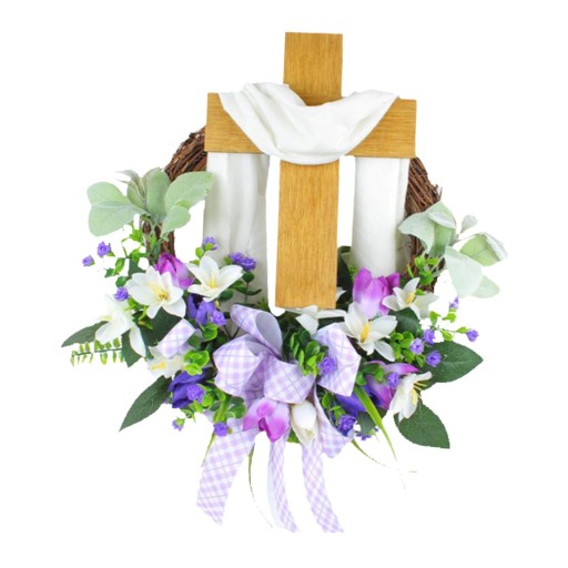Wielkanocny wieniec krzyżowy: ten wielkanocny wieniec krzyżowy z białym jedwabnym szalikiem dodaje smaku sezonowej uroczystości i jest idealny na przyjęcia wielkanocne i dekoracje całoroczne.