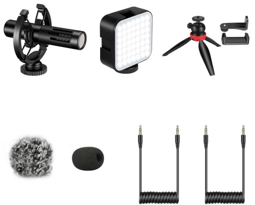 Mozos VLK1 to komplet wszystkich akcesoriów jakich możesz potrzebować aby poprawić jakość swoich filmów z telefonu czy aparatu. W tym wypadku otrzymujemy mikrofon, mocowanie amortyzujące, lampę LED z regulacją jasności, statyw, osłonę przeciwwiatrową i elementy połączeniowe. W zestawie znajdziemy dwa przewody audio. Jeden do połączenia ze smartfonem a drugi do aparatu, lustrzanki.