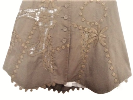 Przedmiotem sprzedaży jest oliwkowa spódniczka marki VILA. . Szydełkowe wstawki i aplikacje zarówno z przodu jak i z tyłu . Częściowo prześwitująca kremowa podszewka z pliskami na dole. Zapięcie na guziki