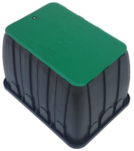 Skrzynka elektrozaworowa Standard o prostokątnej konstrukcji to nowy produkt firmy Irritec udoskonalony o otwory do łatwego wycięcia pod elektrozawory oraz o uchwyty do podtrzymania kabli sterowniczych. Przeznaczona do montażu ziemnego zabezpiecza umieszczone w niej elementy. Zielona pokrywa idealnie wpasuje się w otoczenie każdego ogrodu. Śruba w pokrywie pozwala na szczelne zamknięcie całej obudowy.