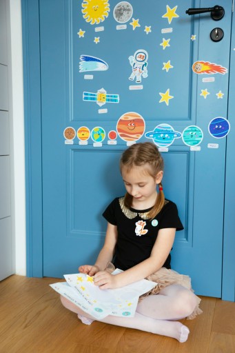 “Kiki Fox in space” to zabawa edukacyjna do NAUKI POJĘĆ O KOSMOSIE W języku angielskim. Wielorazowe naklejki można przyklejać na różne powierzchnie, uczyć się pojęć o kosmosie, a następnie udekorować nimi pokój dziecka.