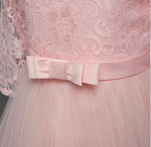 - w pasie ozdobna satynowa kokradka, z tyłu wiązanie na kokardkę.