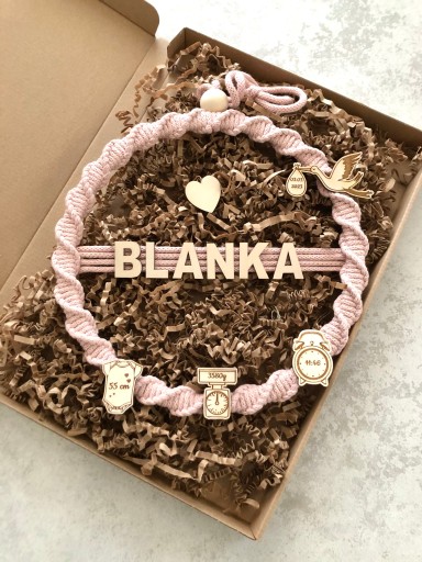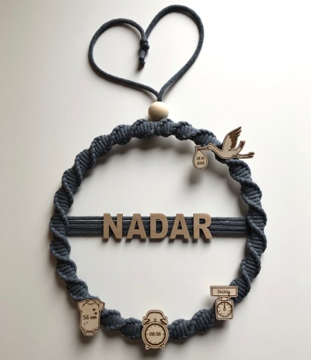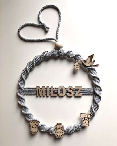 Metryczka wykonana jest z drewnianej obręczy o średnicy 25 cm oraz bawełnianego sznurka.