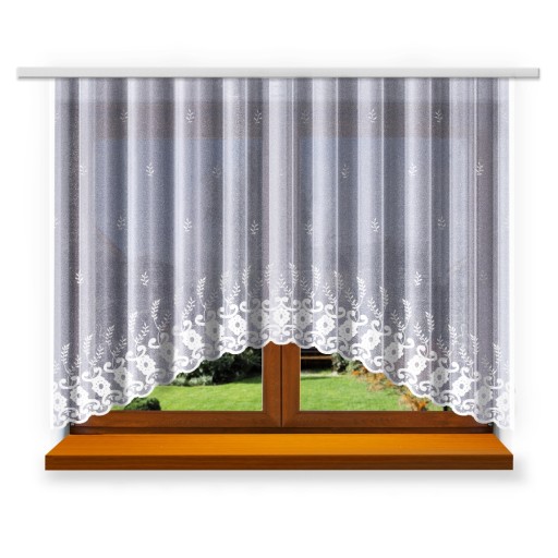 Firana żakardowa wykonana na taśmie 6 cm typu smok. Można powiesić firanę standardowo na żabki lub na haczyki/agrafki lub wsunąć karnisz w tunel który tworzy taśma. W firanie w łuku, różnica między bokami, a środkiem to około 30 cm. Inne rozmiary i fasony firan na naszych pozostałych aukcjach.