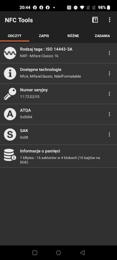 - chip: NXP MiFare Classic 1k - wśród zdjęć znajduje się odczyt programem MiFare Classic Tool
