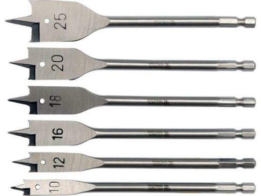 Zestaw wierteł łopatkowych 6 części marki Yato. Profesjonalne wiertła wykonane z utwardzanej stali węglowej. Uchwyt sześciokątny 1/4" umożliwiający szybką wymianę wiertła w uchwycie wiertarki. Nadaje się do wiercenia zarówno w drewnie, jak i w płycie meblowej. Wiertła łopatkowe: 10; 12; 16; 18; 20; 25.