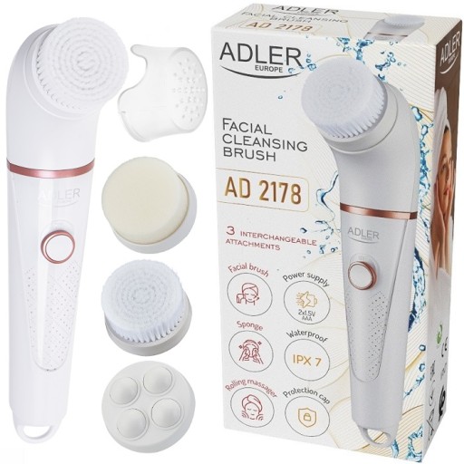 Elektryczna szczoteczka do oczyszczania twarzy AD2178 marki ADLER służy do delikatnej pielęgnacja skóry twarzy. 3w1 - szczoteczka jest wyposażona w 3 wymienne nasadki służące do peelingu, do demakijażu i do aplikacji kremów regeneracyjnych. Pomaga w oczyszczaniu skóry i pobudzaniu krążenia. Szczoteczka jest wodoodporna i spełnia normę IPX7. Zapewnia szereg korzyści pozwalających cieszyć Ci się piękną, zadbaną skórą. Zasilanie bateryjne 2x AAA - brak w zestawie. Cały zestaw zapakowany w estetycznym opakowaniu nadającym się bezpośrednio na prezent.