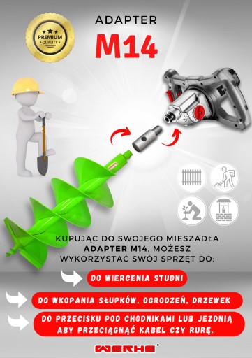 Kupując do swojego mieszadła adapter m14 możesz wykorzystać ten sprzęt do wiercenia studni, wkopania słupków, ogrodzeń, drzewek. Możesz również wykorzystać ją do przecisku pod chodnikami lub jezdnią aby przeciągnąć kabel czy rurę.
