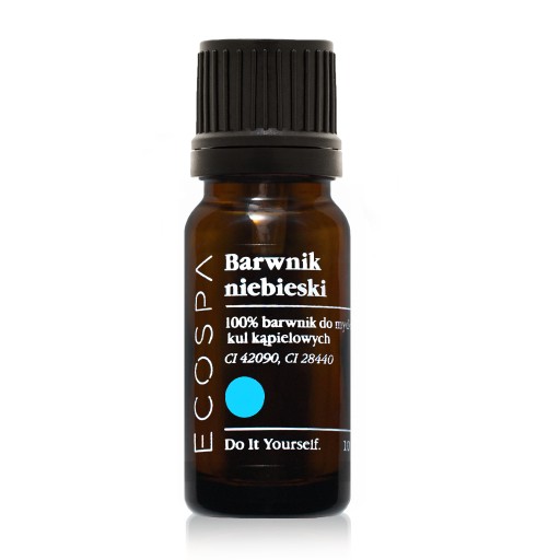 Barwnik niebieski z oferty ECOSPA jest dostępny w szklanej butelce z kroplomierzem, dzięki któremu można łatwo odmierzyć odpowiednią ilość barwnika.