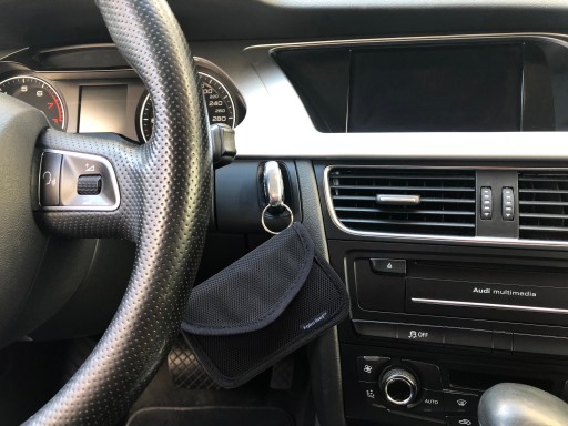 Tylko umieszczenie przedmiotu w kieszeni wyłożonej srebrno szarym materiałem chroni kluczyk oraz karty kredytowe. Druga kieszeń nie zapewnia ochrony, stanowi dodatkowe miejsce np. na prawo jazdy i drobiazgi.