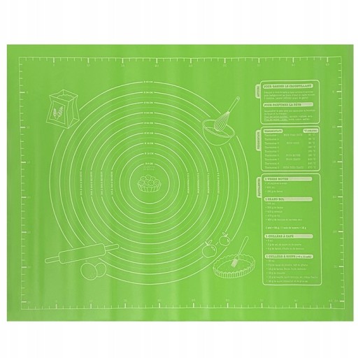 Wykonana z silikonu przeznaczonego do kontaktu z żywnością. Wyposażona w miarki które pomogą odciąć odpowiednią ilość ciasta lub uformować ciasto o odpowiedniej średnicy.Posiada miarkę na dłuższym boku do 45 cm.a na krótszym boku do 35 cm,oraz miarki średnicy.