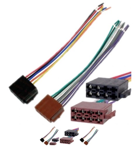Wtyki samochodowe ISO do radia z przewodami. W komplecie wtyk zasilający + głośnikowy.