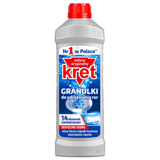 Środek do udrażniania rur KRET w formie granulek. Szybko i skutecznie przywraca drożność rur oraz syfonów w kanalizacji domowej. Bezwzględnie eliminuje zatory stałe i organiczne zapewniając swobodny przepływ przez kanalizację. Likwiduje nieprzyjemne zapachy.