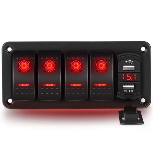 Rozdzielnia do łodzi lub kampera z 4 przełącznikami kołyskowymi on-off. Posiada dwa gniazda USB-A oraz woltomierz. Podświetlana na kolor czerwony led.
