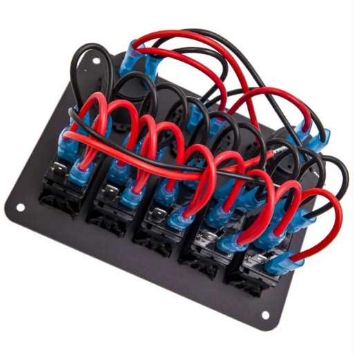 Rozdzielnia do łodzi, z gniazdami USB i woltomierzem. Posiada 5 obwodów z przełącznikami on-off, podświetlanymi na niebiesko.