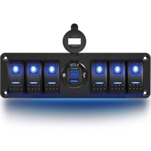 Panel sterowania do jachtu ledowy, z sześcioma przełącznikami i okrągłym gniazdem z woltomierzem i USB. W komplecie wkręty i naklejki na włączniki.