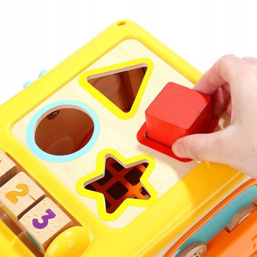 7. Górna ścianka zawiera sorter, który uczy rozpoznawania różnych kształtów i kolorów, oraz pomaga dziecku w rozwoju logicznego myślenia oraz rozwija cierpliwość podczas prób dopasowywania odpowiednich otworów do danego kształtu. Możemy w szybki sposób pomóc dziecku w nauce kolorów, mówiąc aby włożyło np. zieloną gwiazdkę w odpowiednie miejsce itp.
